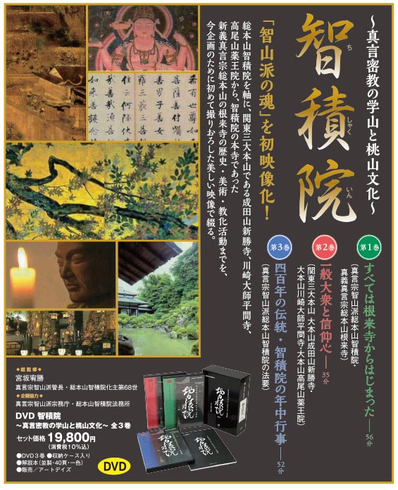 【仕様】DVD全3巻 収納ケース入り 【価格】本体19.800円(消費税込) 【総監修】宮坂宥勝 真言宗智山派管長・総本山智積院化主第68世 【企画協力】真言宗智山派宗務庁・総本山智積院法務所 【解説本】並製・40頁・一色 【販売】アートデイズ チラシ(PDF) |
